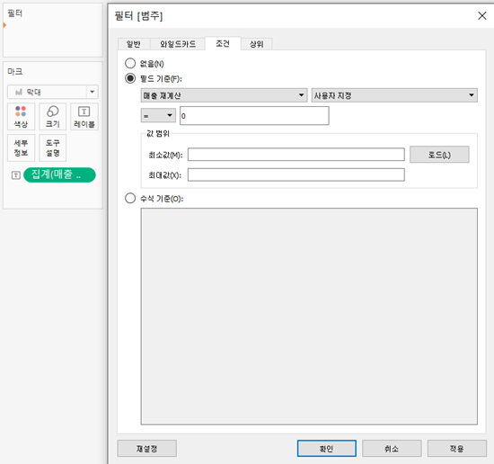 Conditional Filters는 특정 차원을 필터로 사용할 때 나타나는 창에서 ‘조건’ 탭을 선택하면 만들 수 있습니다.