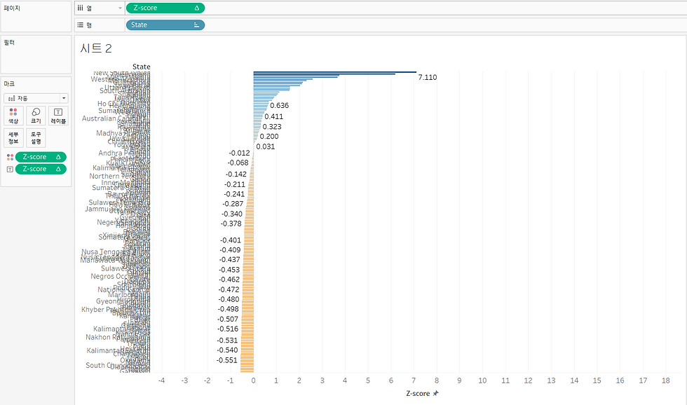#편차에 따른 시각화 편차 차트는 평균 또는 중앙값과 같은 기준에서 값이 얼마나 차이 나는지 보여주는 표현방식입니다. 특정한 품목의 이윤이 평균값에서 많이 벗어나는지를 찾고 싶을 때 불릿 차트, 막대 차트, 혼합 차트를 사용하여 편차를 표시할 수 있습니다. ‘Z-SCORE'와 'STATE'의 값을 차례대로 더블 클릭하여 열과 행에 넣어 넣어보세요.