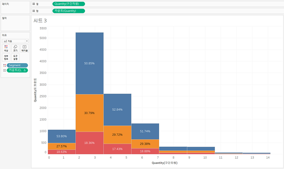 · 히스토그램 차트로 표현된 QUANTITY에 따른 시각화 표현 히스토그램은 분표 형태를 표시하는 차트로 막대 차트처럼 보이지만 연속형 측정값의 값을 범위 또는 구간 차원으로 그룹화합니다. 뷰에 단일 측정값만 있고 차원이 없는 경우 표현방식에서 히스토그램 차트 유형을 사용할 수 있습니다. 그래프 속에서는 주문의 항목 수가 증가할 때 고객 세그먼트별 비율에 증가가 있다는 것이 보이지 않는 것을 확인할 수 있습니다.