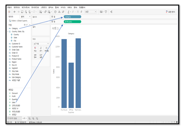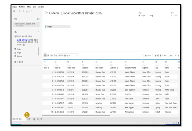 이 화면이 여러분의 태블로에서 처음 데이터 시각화 화면이에요!
