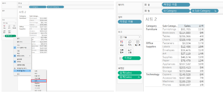 #순위 (Rank) 순위는 원하는 기준값에 따라 랭크를 매기는 것으로 오른 차선, 내림차순 순으로 선택할 수 있다. 아래와 같이 합계에 대한 랭크를 생성하기 위해서는 퀵테이블로 랭크 합계를 생성한 후 합계를 하나 더 만들어 준다. 랭크의 형식은 엑셀파일과 같이 오른쪽 마우스를 클릭하여 서식을 누르고 필드에서 합계의 순위 서식을 편집해 준다. 숫자 뒤에 '위'와 같은 단어를 추가하고 싶다면 사용자 지정을 통해 설정해 주면 된다.