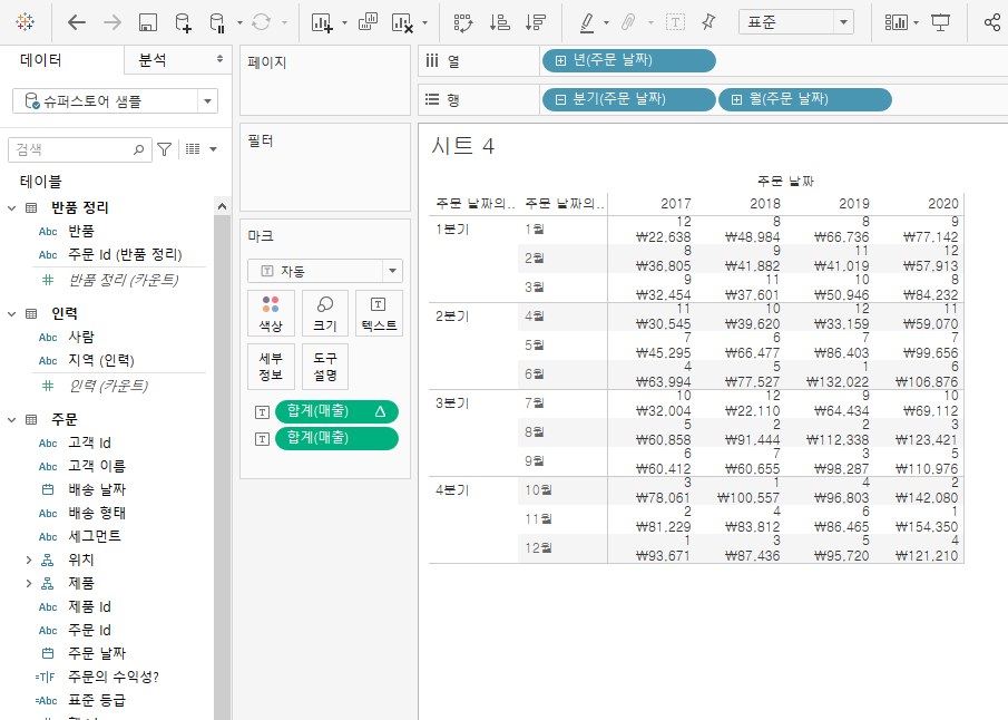 '주문 날짜'를 열에, '분기'와 '월'을 행에다가 놓고, '매출' 필드를 텍스트 마크에 가져다 놓습니다.