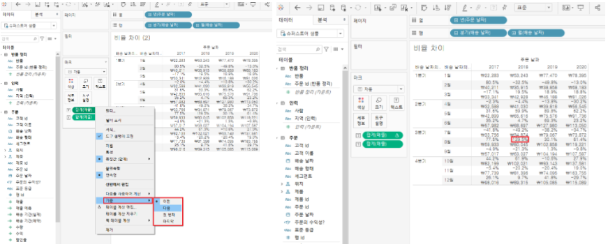 비율 차이 테이블 계산은 현재 값과 다른 값 간의 차이를 비율로 계산합니다. 비율 차이 또는 비율 계산에서는 항상 두 개의 값, 즉 현재 값과 차이 계산의 기준이 되는 값을 고려해야 합니다. 대부분의 경우 현재 값과 이전 값 간의 차이를 계산할 것입니다. 하지만 합계(매출) 필드 우클릭 후 '기준'을 선택하여 차이를 계산할 다른 비교 대상 기준을 지정할 수 있습니다. 아래와 같이 현재 값과 이전 값의 비율 차이 뿐만 아니라 현재 값과 다음 값, 현재 값과 첫번째 셀에 있는 값 간의 비율 차이를 구할 수도 있습니다.