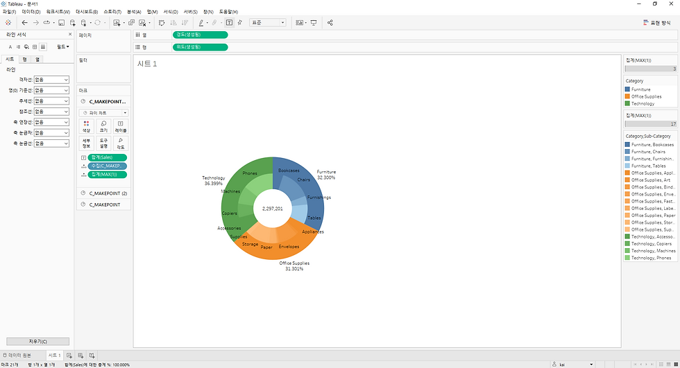 <Sample – Superstore>데이터에는 기본적으로 Product라는 계층이 만들어져 있습니다. 계층이 만들어져 있지 않다면 계층을 만들고자 하는 Column을 우클릭하여 계층을 만들 수 있습니다.선버스트에 사용할 Column은 [Category]와 [Sub-Category]를 사용하겠습니다.