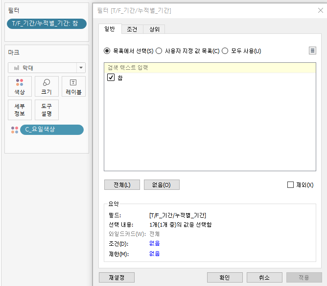 4) 누적차트에도 매개변수 TRUE/FALSE 조건식을 만들어 참을 체크하여 필터에 넣어주세요.